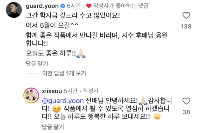 그러자 배우 윤경호는 “그간 학자금 갚느라 수고 많았어요! 어서 5월이 오길^^ 함께 좋은 작품에서 만나길 바라며, 지수 후배님 응원합니다!! 오늘도 좋은 하루!!”라는 댓글을 남기며 훈훈한 선배미를 드러냈다.