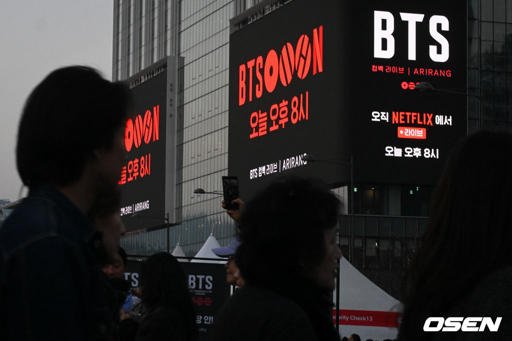 그룹 방탄소년단(BTS)이 21일 서울 광화문 광장에서 무료 복귀 공연 'BTS 컴백 라이브: 아리랑'(BTS THE COMEBACK LIVE | ARIRANG)을 앞둔 가운데 전광판에 공연이 안내되고 있다.