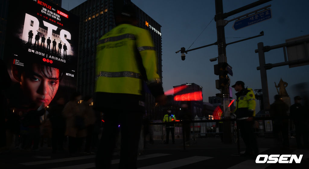 그룹 방탄소년단(BTS)이 21일 서울 광화문 광장에서 무료 복귀 공연 'BTS 컴백 라이브: 아리랑'(BTS THE COMEBACK LIVE | ARIRANG)을 앞둔 가운데 경찰이 거리를 통제하고 있다.