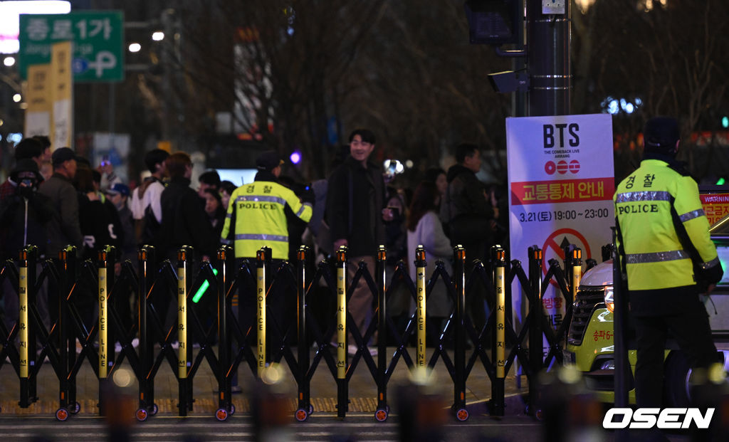 그룹 방탄소년단(BTS)이 21일 서울 광화문 광장에서 무료 복귀 공연 'BTS 컴백 라이브: 아리랑'(BTS THE COMEBACK LIVE | ARIRANG)을 앞둔 가운데 경찰이 거리를 통제하고 있다.