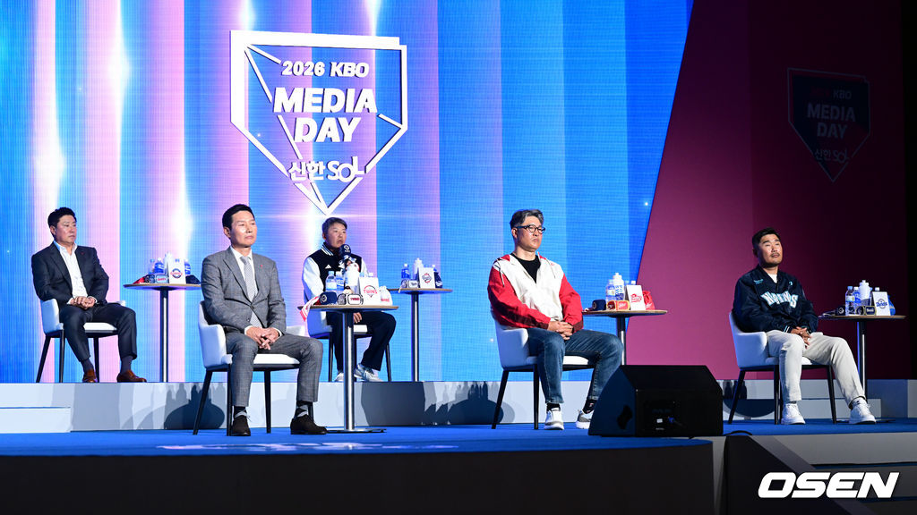 롯데 김태형 감독(왼쪽부터), LG 염경엽 감독, 두산 김원형 감독, SSG 이숭용 감독, NC 이호준 감독이 질문을 듣고 있다. 2026.03.26 /cej@osen.co.kr