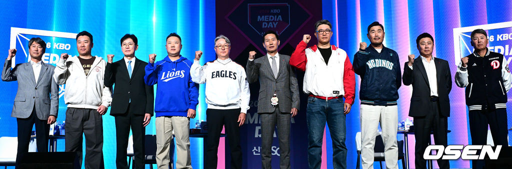 키움 설종진(왼쪽부터), KIA 이범호, KT 이강철, 삼성 박진만, 한화 김경문, LG 염경엽, SSG 이숭용, NC 이호준, 롯데 김태형, 두산 김원형 감독이 포즈를 취하고 있다. 2026.03.26 /cej@osen.co.kr