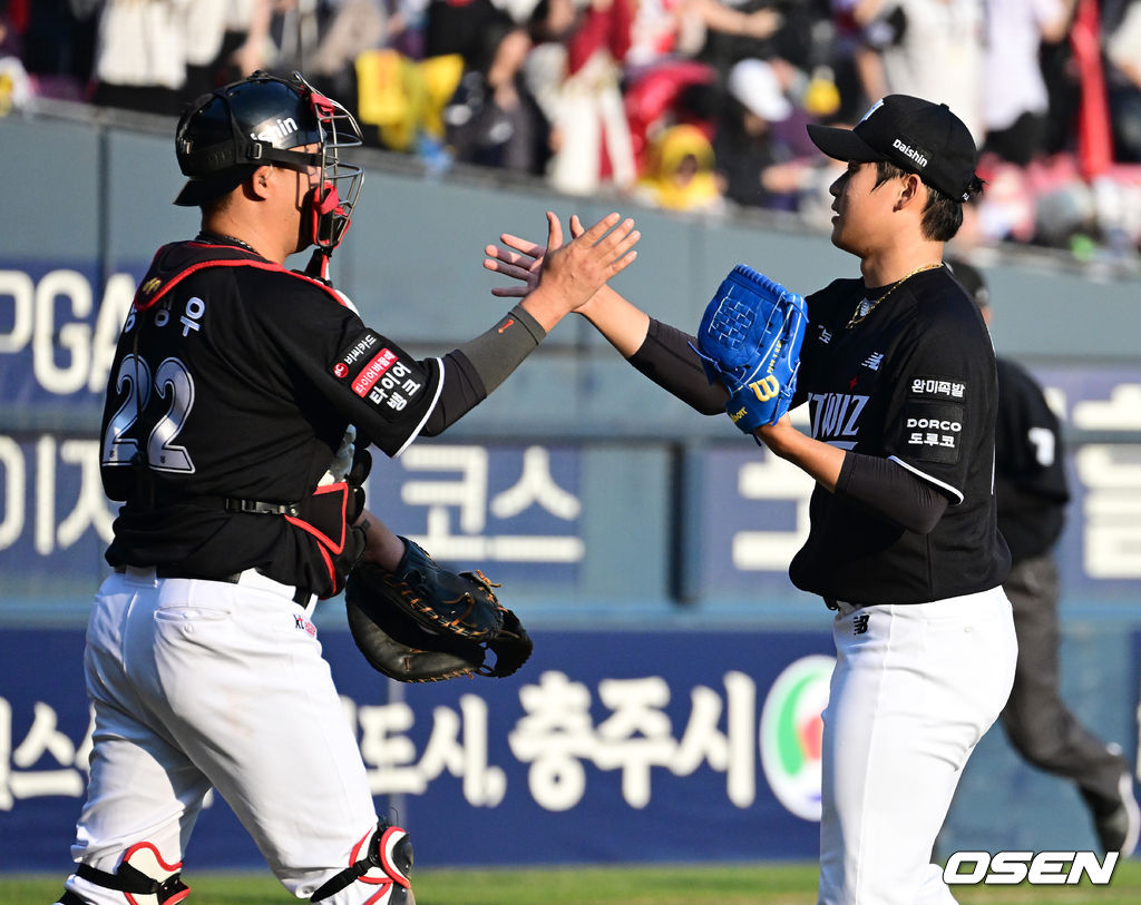 경기를 마치고 KT 장성우, 박영현이 승리를 기뻐하고 있다. 2026.03.28 / jpnews@osen.co.kr