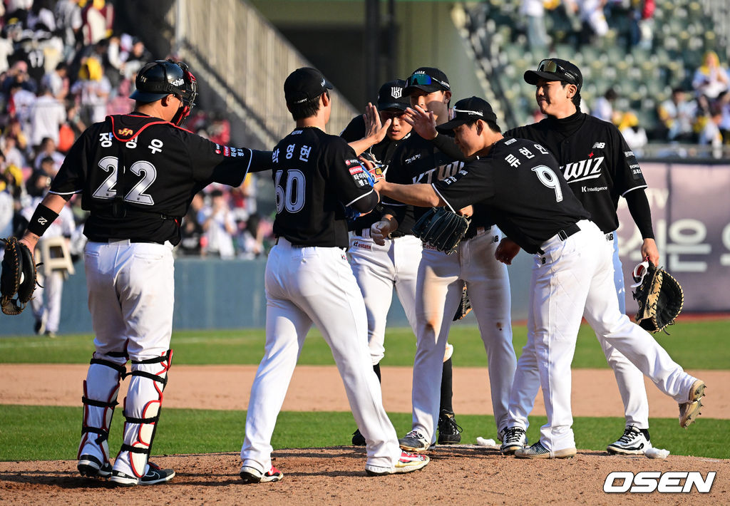경기를 마치고 KT 선수들이 승리 하이파이브를 하고 있다. 2026.03.28 / jpnews@osen.co.kr
