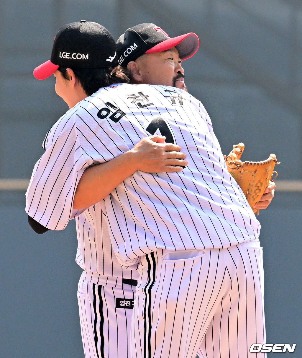 LG 김용일 수석트레이닝코치가 시구에 앞서 임찬규와 포옹을 하고 있다. 2026.03.28 / jpnews@osen.co.kr