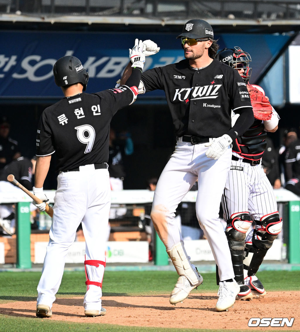 7회초 2사 2루에서 KT 힐리어드가 투런포를 날리며 류현인과 기뻐하고 있다. 2026.03.28 / jpnews@osen.co.kr