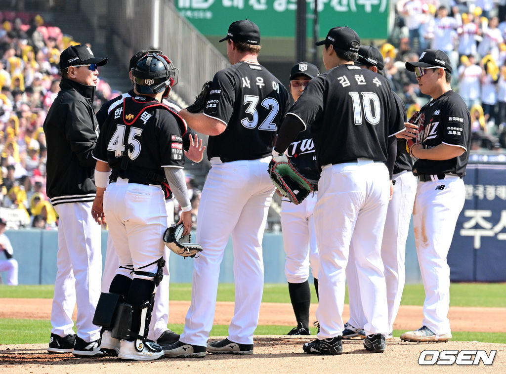1회말 2사 만루에서 KT 이강철 감독이 마운드에 올라 사우어를 비롯한 야수진과 이야기를 나누고 있다. 2026.03.28 / jpnews@osen.co.kr