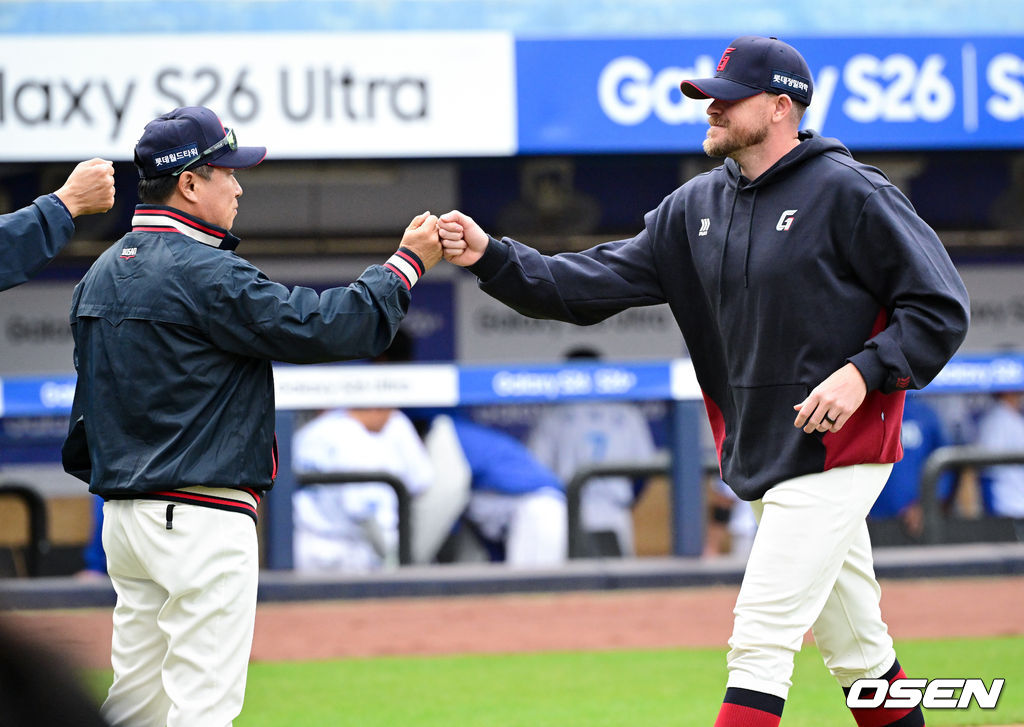 롯데 김태형 감독, 비슬리가 승리를 기뻐하고 있다. 2026.03.29 /cej@osen.co.kr