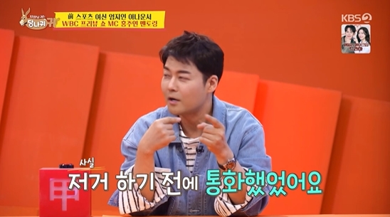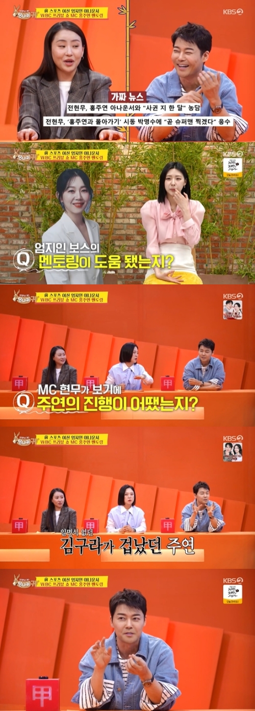 홍주연 아나운서는 성공적으로 '프리뷰 쇼'를 마쳤고, 김숙은 "전현무 씨가 보기에는 냉정하게 어떤가?"라고 질문했다. 이에 전현무는 "사실 주연 씨가 저거하기 전에 나랑 통화했었다. 김구라 씨를 처음 봐서 너무 겁이 난다고 하더라"며 "내가 구라 형은 여자에게 젠틀하다고 한 마디 해줬다. 방송도 너무 잘한 것 같다"며 애정 가득한 칭찬을 내놨다.
