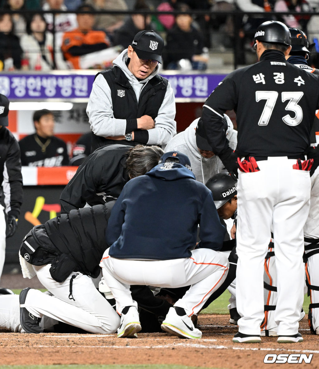 5회초 1사 1,2루에서 KT 허경민이 한화 엄상백 투구에 머리를 맞았다. 허경민 상태 살피는 이강철 감독. 2026.03.31 /sunday@osen.co.kr