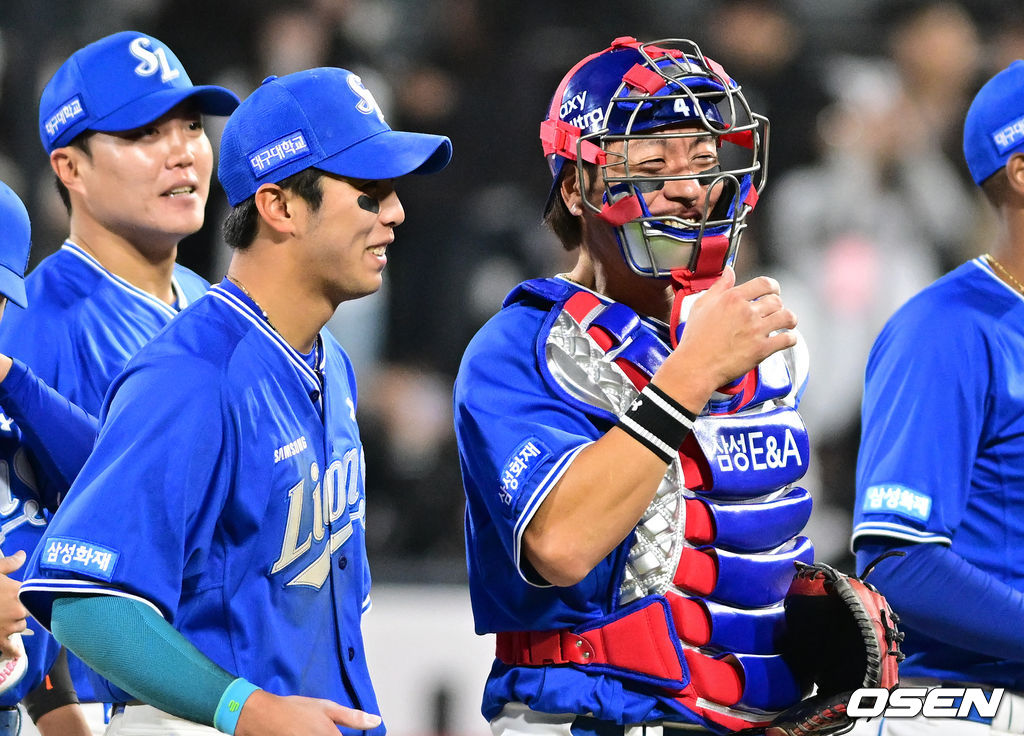 김영웅 못지않게 답답할 상황이지만 강민호는 팀의 승리가 확정된 뒤 김영웅에게 먼저 다가가 웃으며 주먹을 맞대며 베테랑의 여유를 보여줬다.