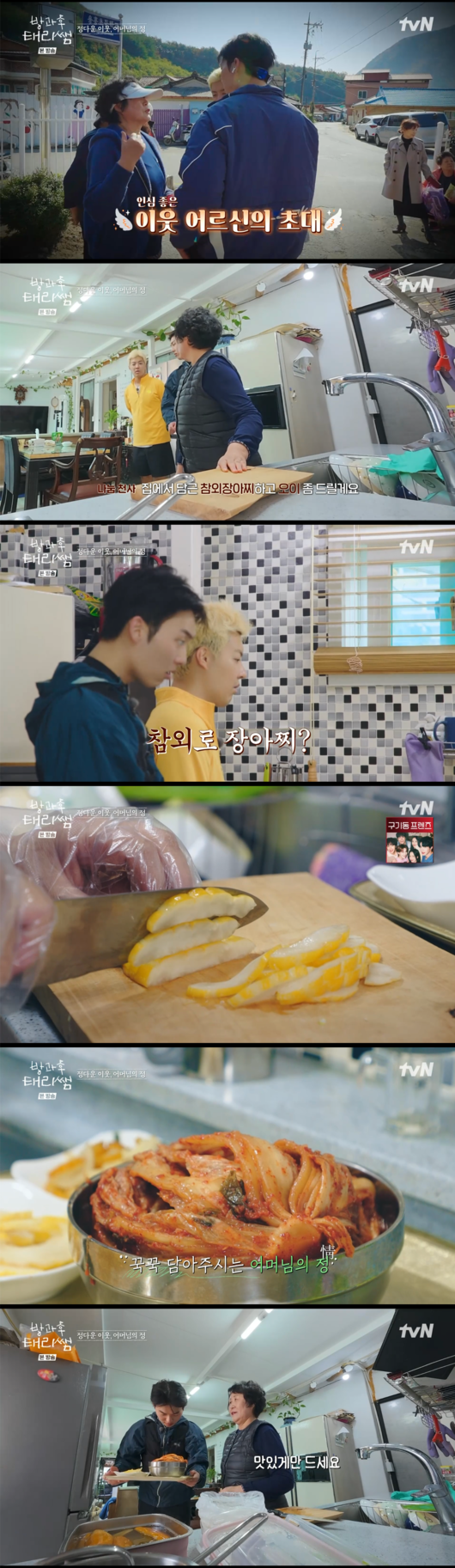 두 사람은 감사한 마음으로 이웃 주민의 집을 방문했다. 주민은 단순히 김치만 내어주는 것에 그치지 않고 “그러면 김치하고 참외장아찌하고 오이 좀 드릴게요”라며 아껴둔 찬장과 냉장고를 아낌없이 열어젖혔다.