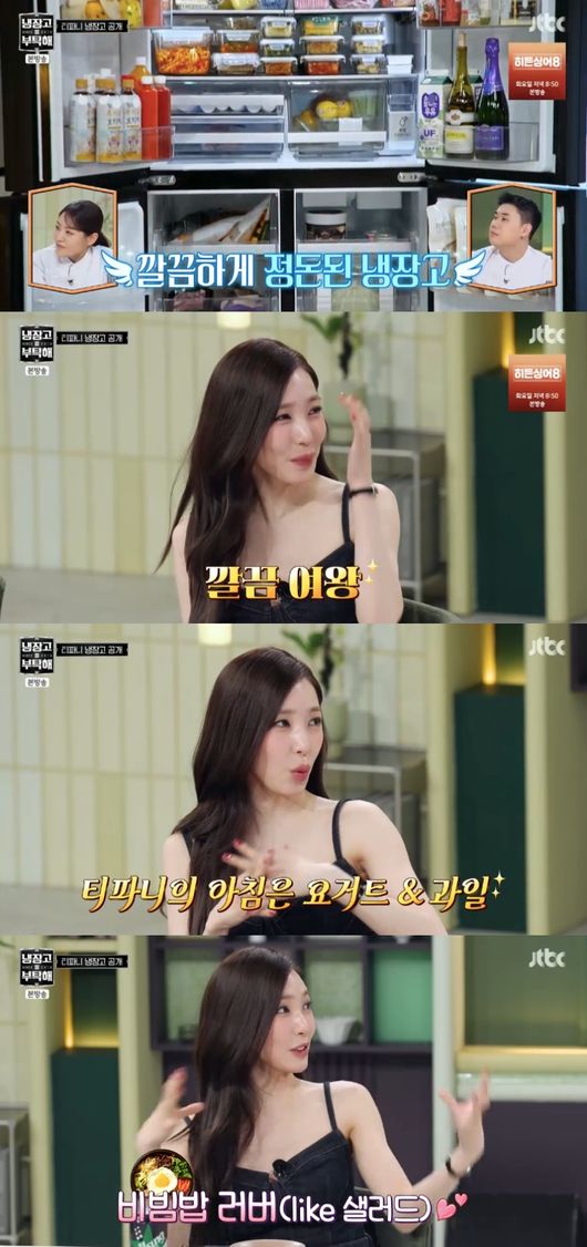 이날 깔끔하게 정돈된 티파니의 냉장고가 공개됐다. 요거트, 단백질 음료 등이 발견되자 티파니는 “아침에는 간단하게 먹는다. 점심은 샐러드, 저녁에는 한식을 먹는다. 제가 비빔밥을 좋아한다”라고 말했다.