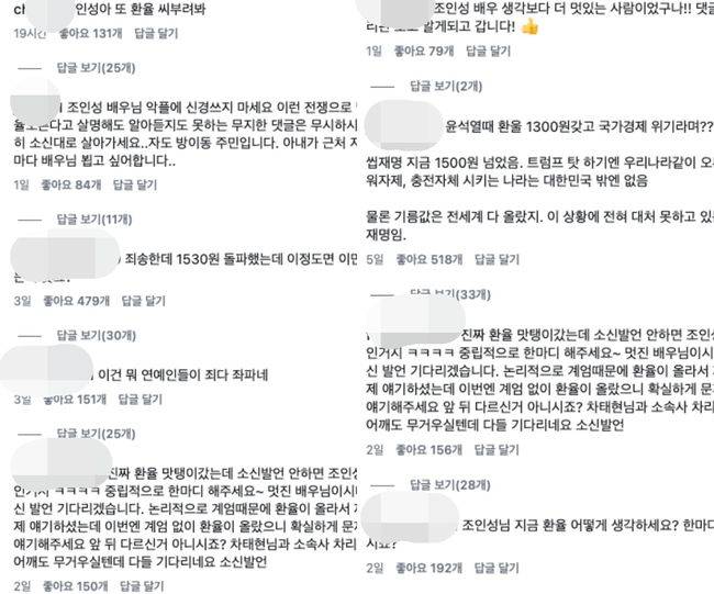 악플러들은 최근 1500원 안팎으로 치솟은 환율을 언급하며 비상계엄 사태 당시의 전 정부와 현 정부의 치적을 비교하려 들었다. 악플 대부분이 '환율'에 관한 것이었다. 전후 맥락을 삭제한 채 "지금 환율이 이래서 촬영 다 접은 상태죠?", "이 정도 환율이면 이민 가야하는 거 아니냐", "어떡해 이제 환율 올라서 로케이션도 못 가시겠다"라는 비꼬는 발언이 다수를 이뤘다. 더불어 "중립적으로 한 마디 해라", "연예인들 죄다 좌파네"와 같은 특정 정치적 성향을 배척하는 악플도 존재했다.