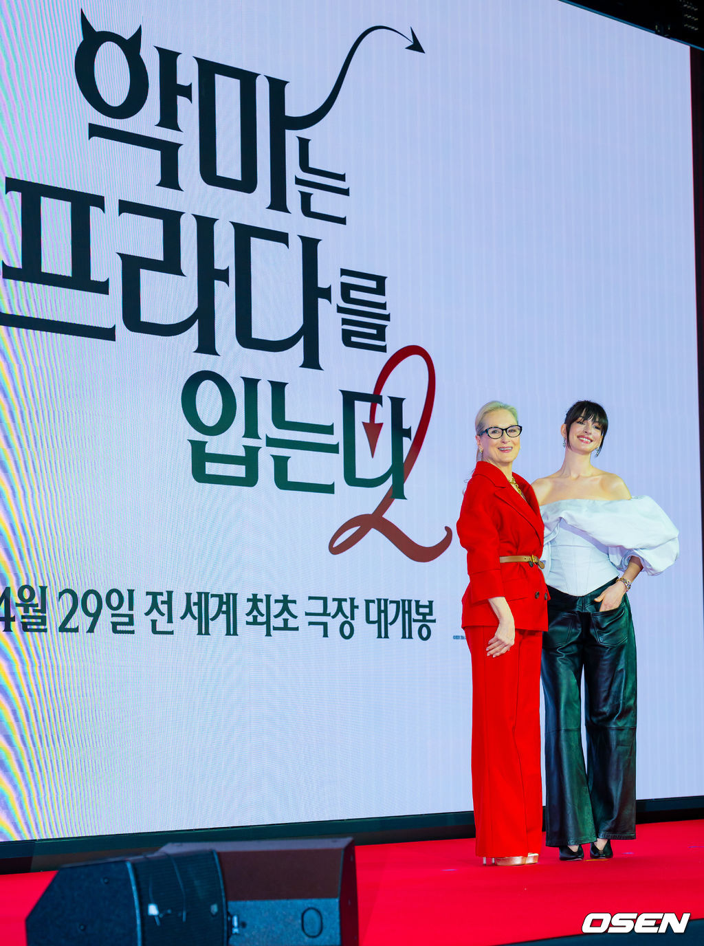 배우 메릴 스트립, 앤 해서웨이가 입장하며 포즈를 취하고 있다. 2026.04.08/rumi@osen.co.kr