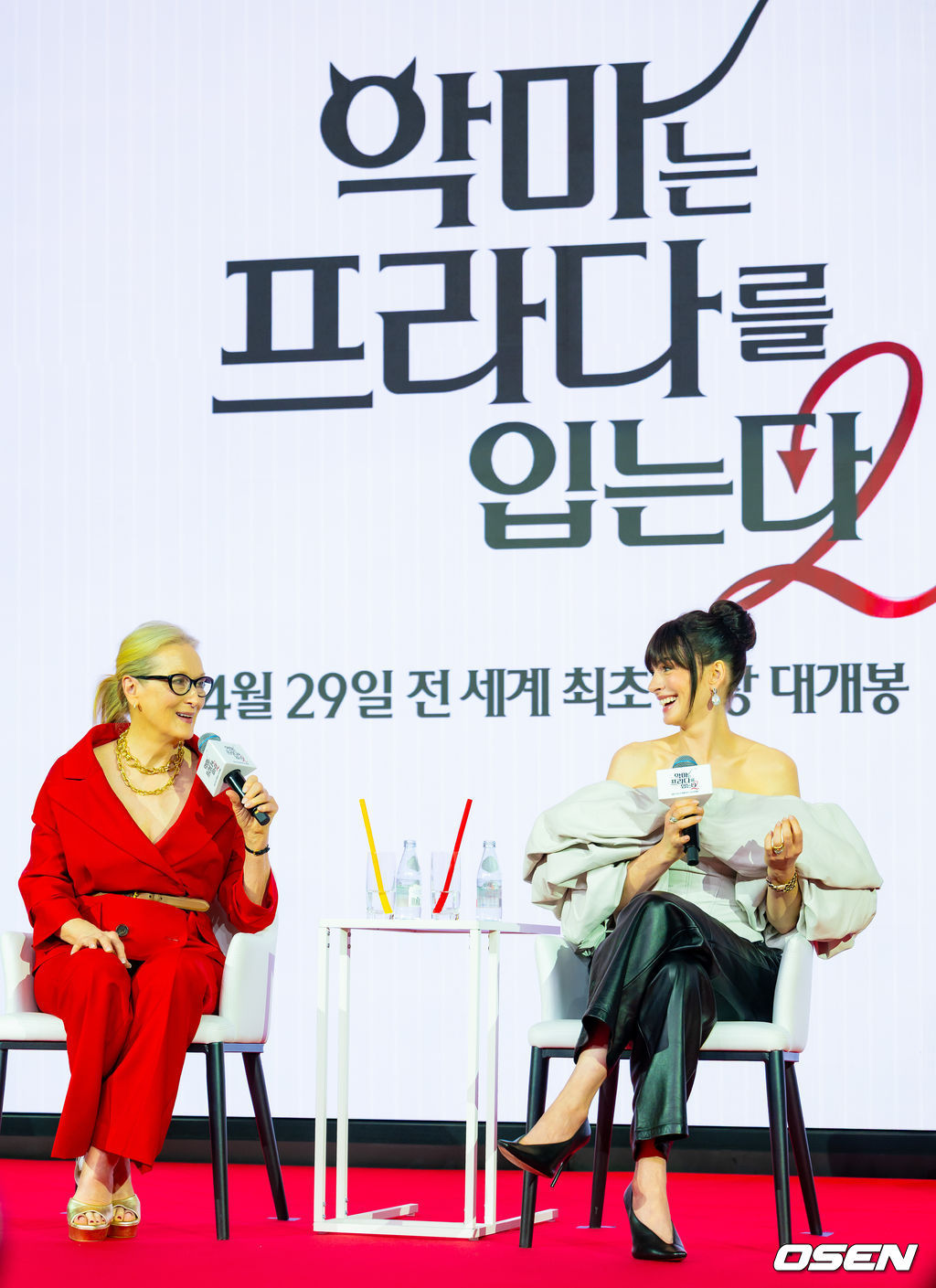배우 메릴 스트립, 앤 해서웨이가 기자간담회를 하고 있다. 2026.04.08/rumi@osen.co.kr