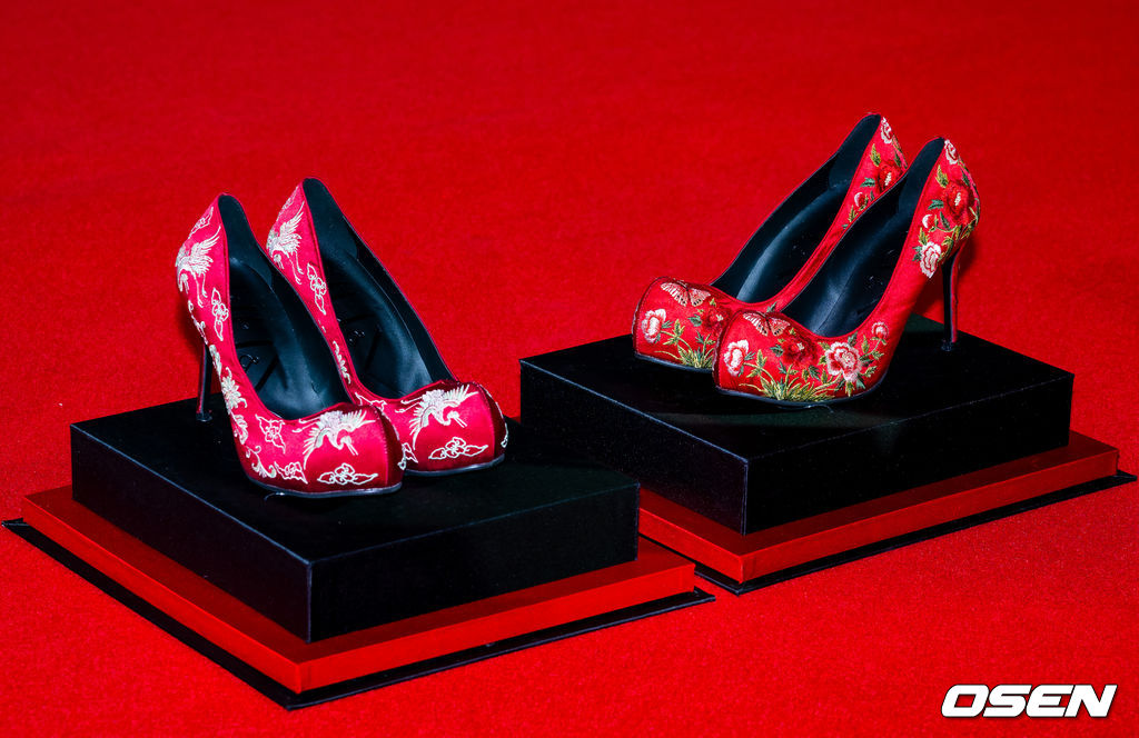 배우 메릴 스트립, 앤 해서웨이가 기자간담회에서 선물 받은 꽃신 스타일의 하이힐이 전시되고 있다. 2026.04.08/rumi@osen.co.kr
