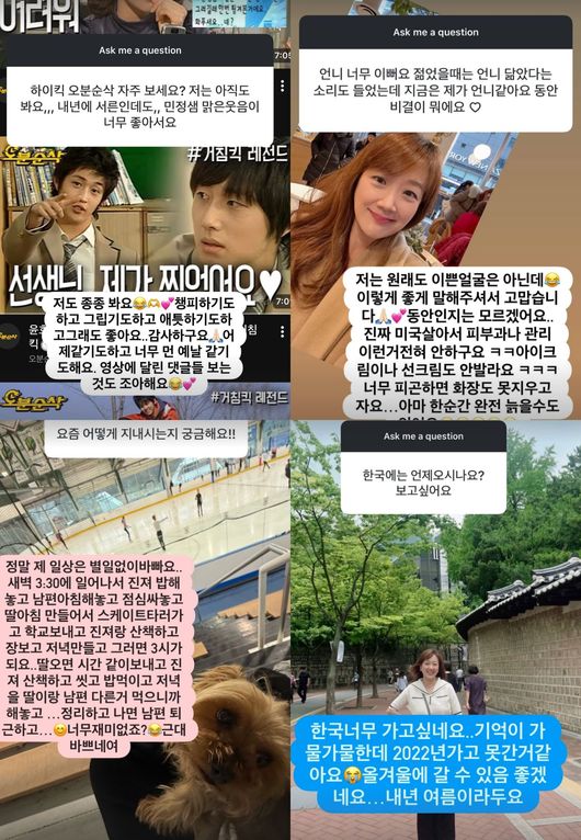 특히 그는 근황에 대해 "제 일상은 별일 없이 바쁘다. 새벽 3시 30분에 일어나서 진저 밥해놓고 남편 아침해 놓고 점심 싸 놓고 딸 아침 만들어서 스케이트 타러 가고, 학교 보내고. 진져랑 산책하고 장 보고 저녁 만들고. 그러면 3시가 된다. 딸 오면 시간 같이 보내고 진져 산책하고 씻고 밥 먹이고 저녁을 딸이랑 남편 다른 거 먹으니까 해 놓고. 정리하고 나면 남편 퇴근하고.. 너무 재미없죠? 근데 바쁘네요"라고 말해 눈길을 끌었다.