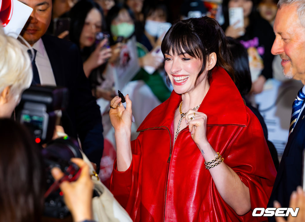 배우 앤 해서웨이가 팬들에게 사인을 해주고 있다. 2026.04.08/rumi@osen.co.kr