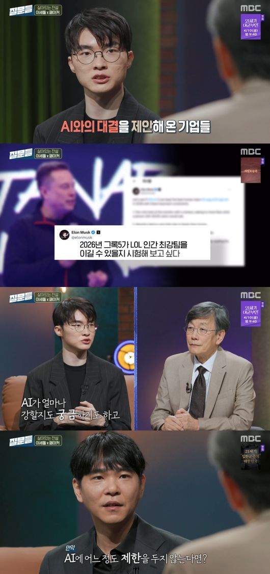 페이커는 ‘우린 준비됐다. 너는?’이라며 일론 머스크의 ‘그록5’와의 대결 제안을 받아들였다. 손석희는 “많은 팬들이 엄청난 환호성을 보냈다. AI와의 대결 불안하지 않냐”라고 질문했다.