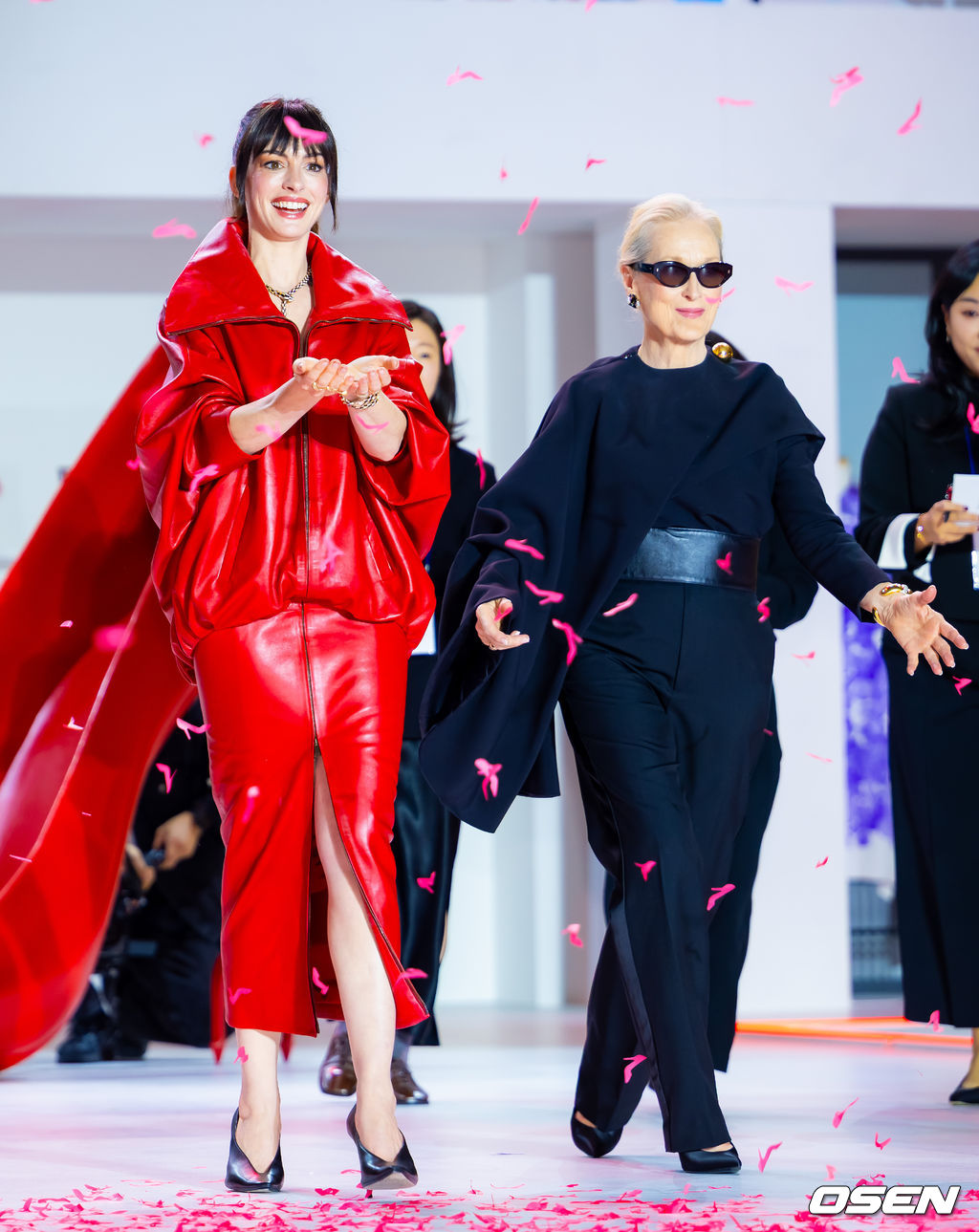 배우 앤 해서웨이, 메릴 스트립가 무대 위에서 포즈를 취하고 있다. 2026.04.08/rumi@osen.co.kr