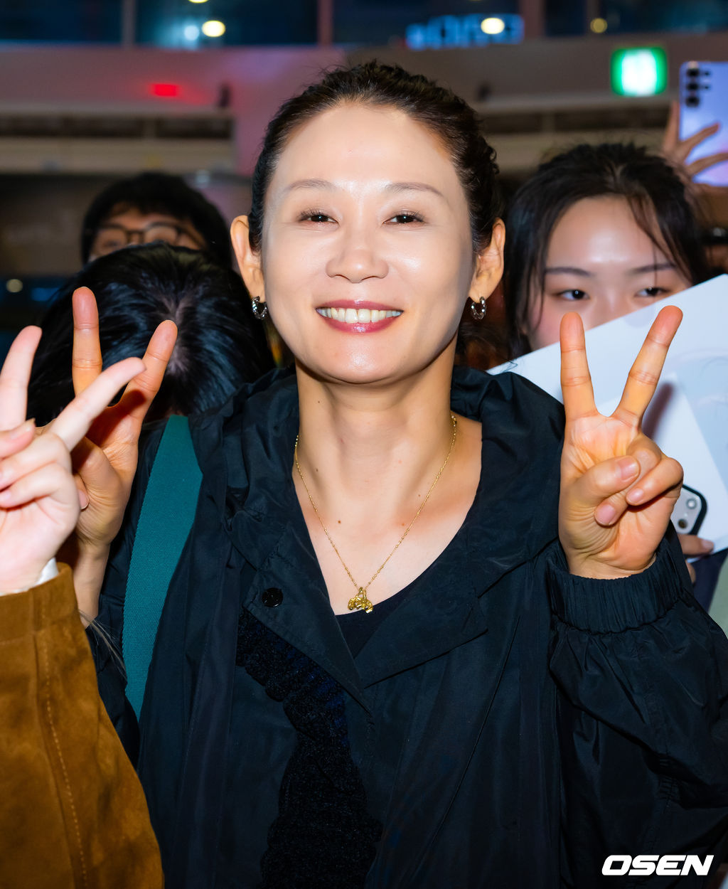 배우 김선영이 팬들 사이에서 배우 앤 해서웨이, 메릴 스트립을 보기 위해 기다리며 환하게 웃고 있다. 2026.04.08/rumi@osen.co.kr