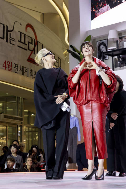 뜨거운 분위기 속 메릴 스트립과 앤 해서웨이의 등장에 한국 팬들은 열띤 환영과 함성을 쏟아냈고, 두 배우는 이에 화답하듯 음악에 맞춰 춤을 추며 현장의 텐션을 최고조로 끌어올렸다. 메릴 스트립과 앤 해서웨이는 꿀 떨어지는 눈빛과 유쾌한 태도로 현장을 찾아준 한국 팬들 한 명 한 명과 소통하는 시간을 가지며 레전드다운 팬서비스로 모두를 사로잡았다.