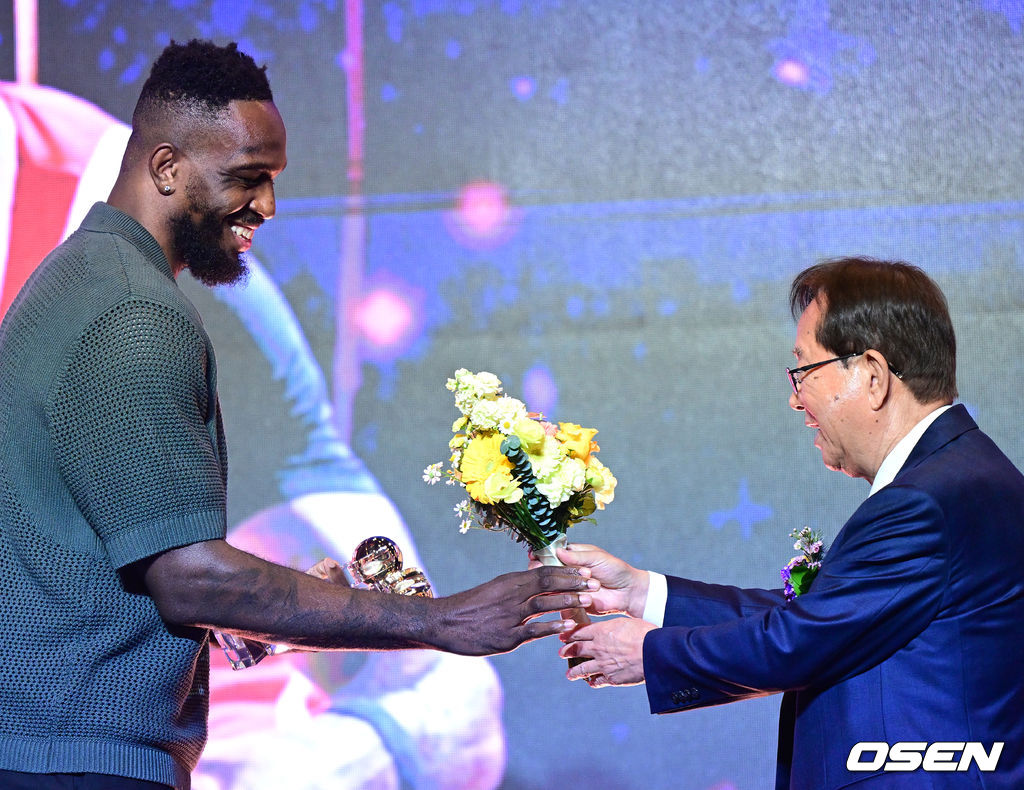 SK 자밀 워니가 KBL 이수광 총재에게 트로피와 꽃다발을 전달받고 있다. 2026.04.09 / dreamer@osen.co.kr