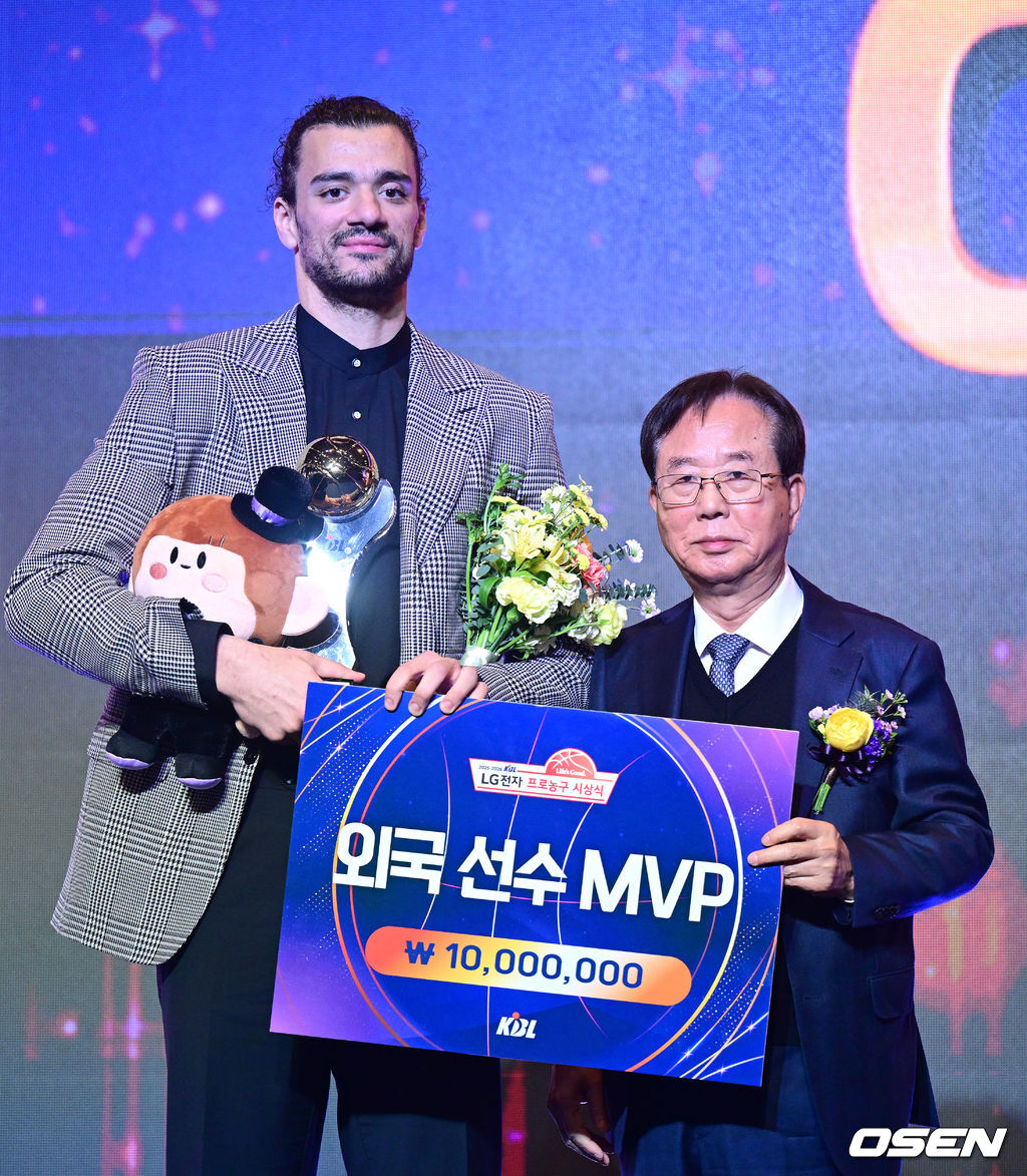 외국선수 MVP를 거머쥔 창원 LG 아셈 마레이가 KBL 이수광 총재와 포즈를 취하고 있다. 2026.04.09 / dreamer@osen.co.kr