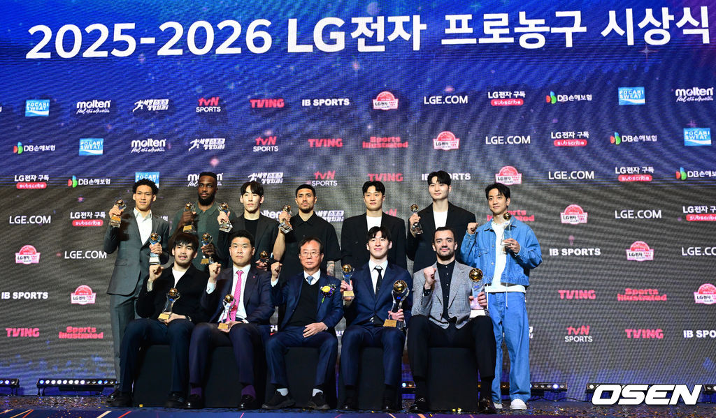 국내선수 MVP 고양 소노 이정현, 외국선수 MVP 창원 LG 아셈 마레이, 신인선수상 고양 소노 케빈 켐바오를 비롯한 수상자들과 KBL 이수광 총재가 포즈를 취하고 있다. 2026.04.09 / dreamer@osen.co.kr
