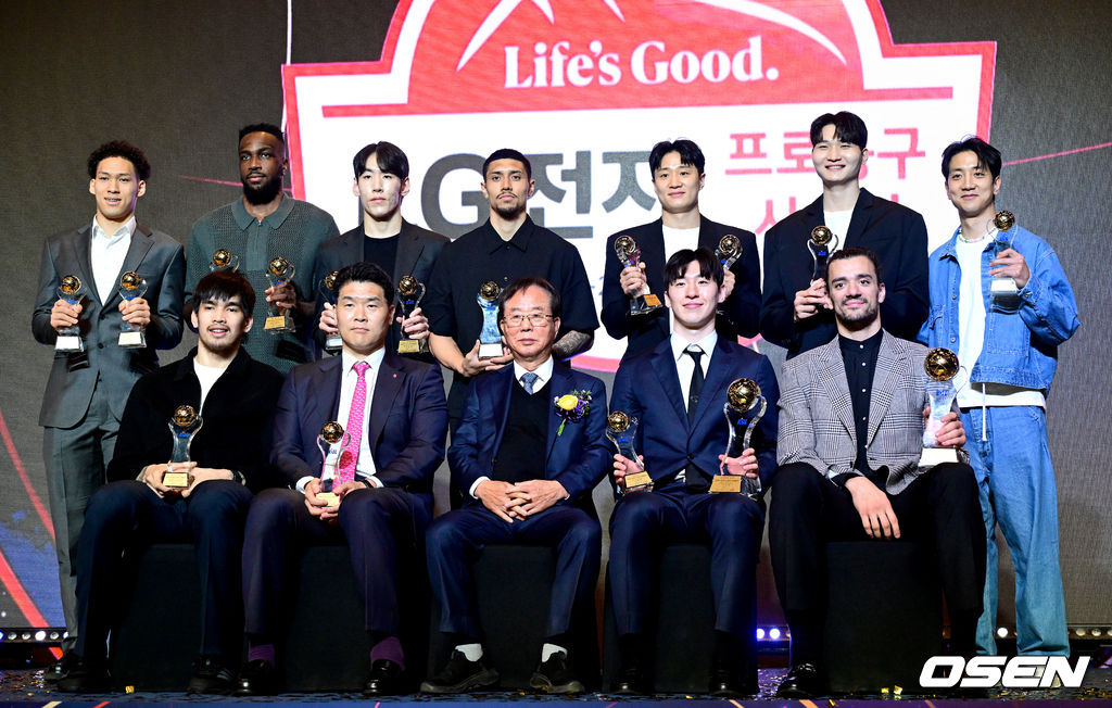 국내선수 MVP 고양 소노 이정현, 외국선수 MVP 창원 LG 아셈 마레이, 신인선수상 고양 소노 케빈 켐바오를 비롯한 수상자들과 KBL 이수광 총재가 포즈를 취하고 있다. 2026.04.09 / dreamer@osen.co.kr