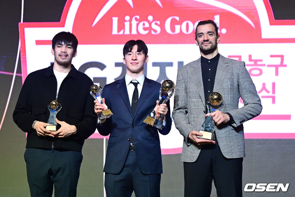 국내선수 MVP 고양 소노 이정현(가운데), 외국선수 MVP 창원 LG 아셈 마레이(오른쪽), 신인선수상 고양 소노 케빈 켐바오가 포즈를 취하고 있다. 2026.04.09 / dreamer@osen.co.kr