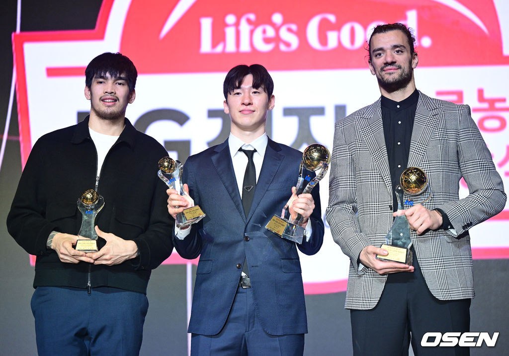 국내선수 MVP 고양 소노 이정현(가운데), 외국선수 MVP 창원 LG 아셈 마레이(오른쪽), 신인선수상 고양 소노 케빈 켐바오가 포즈를 취하고 있다. 2026.04.09 / dreamer@osen.co.kr
