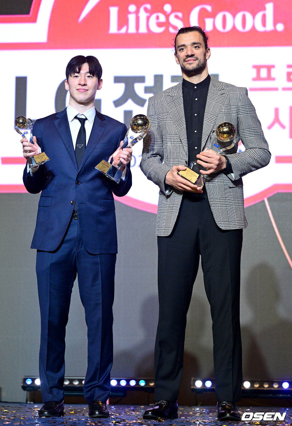 국내선수 MVP 고양 소노 이정현(왼쪽)과 외국선수 MVP 창원 LG 아셈 마레이가 트로피와 함께 포즈를 취하고 있다. 2026.04.09 / dreamer@osen.co.kr