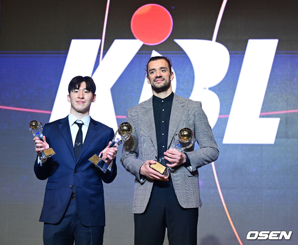 국내선수 MVP 고양 소노 이정현(왼쪽)과 외국선수 MVP 창원 LG 아셈 마레이가 트로피와 함께 포즈를 취하고 있다. 2026.04.09 / dreamer@osen.co.kr