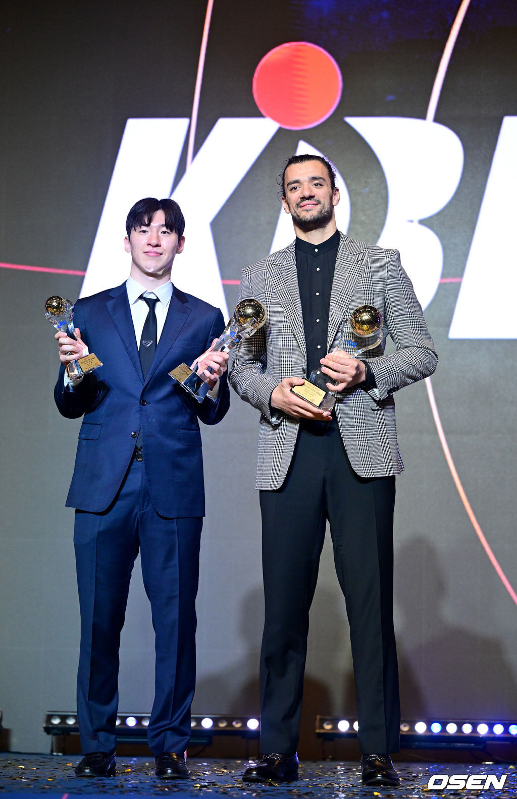 국내선수 MVP 고양 소노 이정현(왼쪽)과 외국선수 MVP 창원 LG 아셈 마레이가 트로피와 함께 포즈를 취하고 있다. 2026.04.09 / dreamer@osen.co.kr