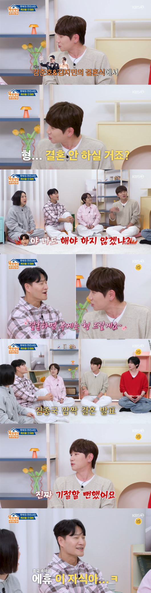 케이윌은 김종국을 보고 “형 결혼하시기 전에 김준호 김지민 결혼식에서 하객 사진 찍으러 나갔을 때 형을 본거예요”라고 운을 뗐다. 당시 김종국이 당연히 결혼을 안 할 것이라고 생각했던 케이윌은 김종국에게 “형 결혼 안 하실거죠?”라고 물었다고 밝혔다.