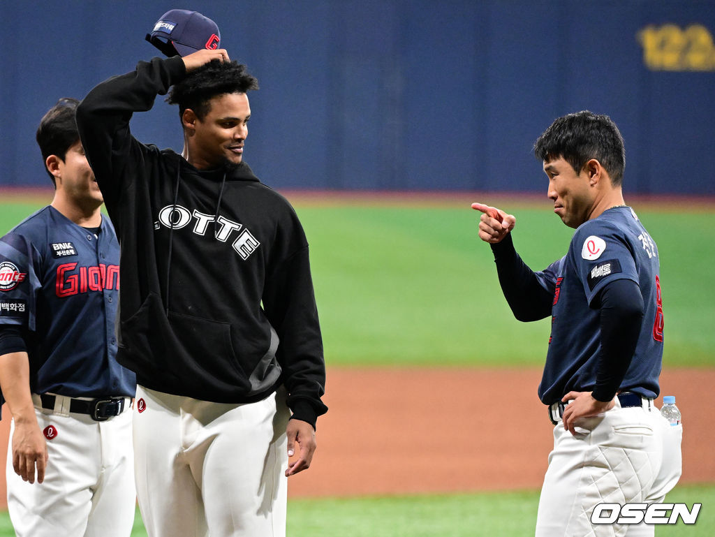 경기를 마치고 롯데 로드리게스, 전준우가 승리를 기뻐하고 있다. 2026.04.10 / jpnews@osen.co.kr
