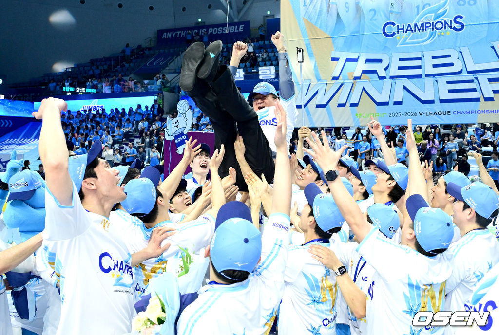 조원태 대한항공 구단주 겸 KOVO 총재가 선수들에게 헹가래를 받고 있다. 2026.04.10 / dreamer@osen.co.kr