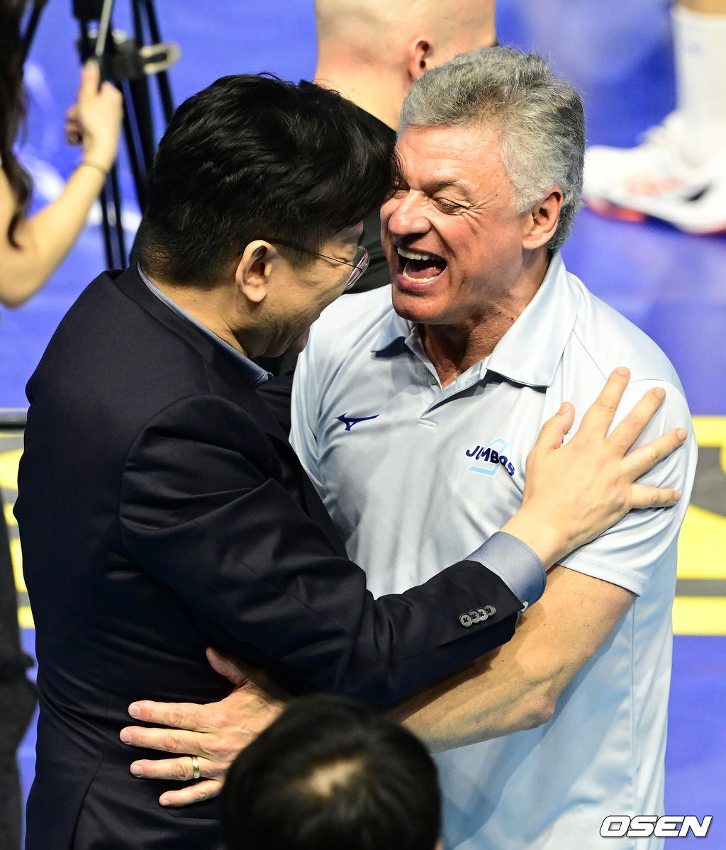 경기 종료 직후 대한항공 조원태 구단주 겸 KOVO 총재와 헤난 달 조토 감독이 기뻐하고 있다. 2026.04.10 / dreamer@osen.co.kr