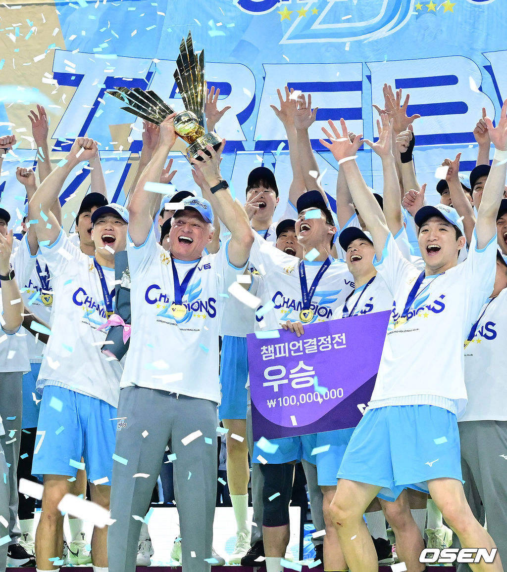 대한항공 헤난 달 조토 감독이 선수들과 트로피를 번쩍 들며 환호하고 있다. 2026.04.10 / dreamer@osen.co.kr