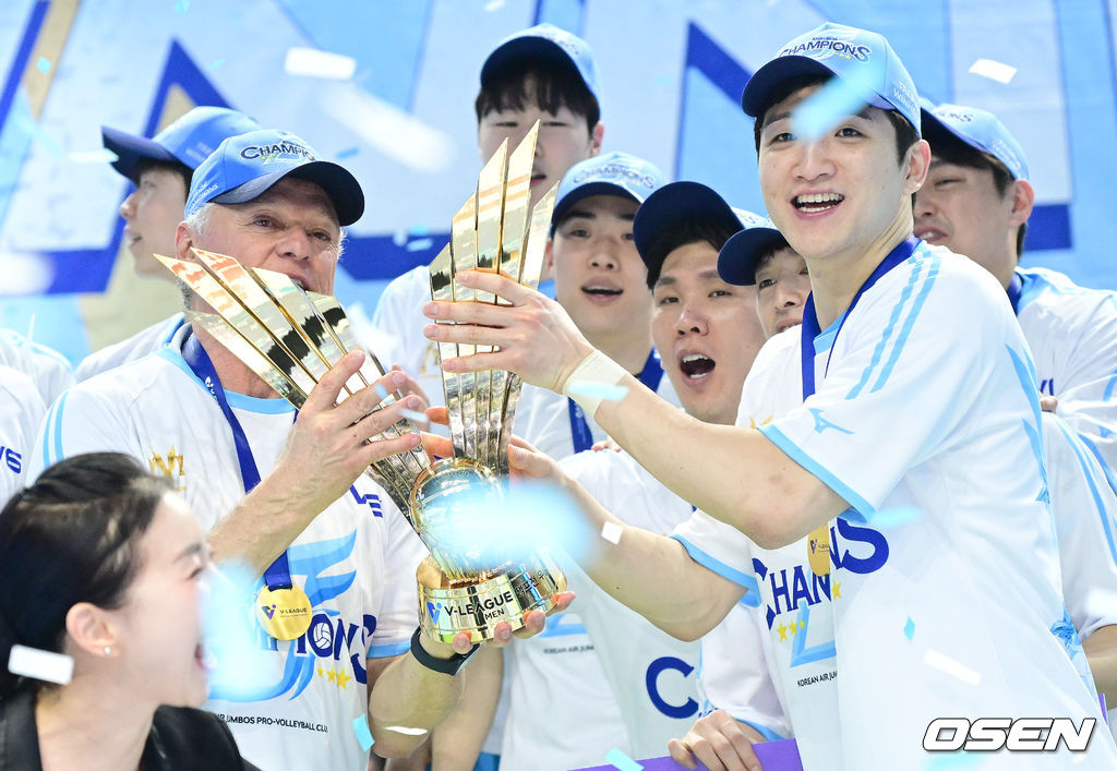우승을 거머쥔 대한항공 헤난 달 조토 감독과 정지석이 트로피를 들고 기뻐하고 있다. 2026.04.10 / dreamer@osen.co.kr