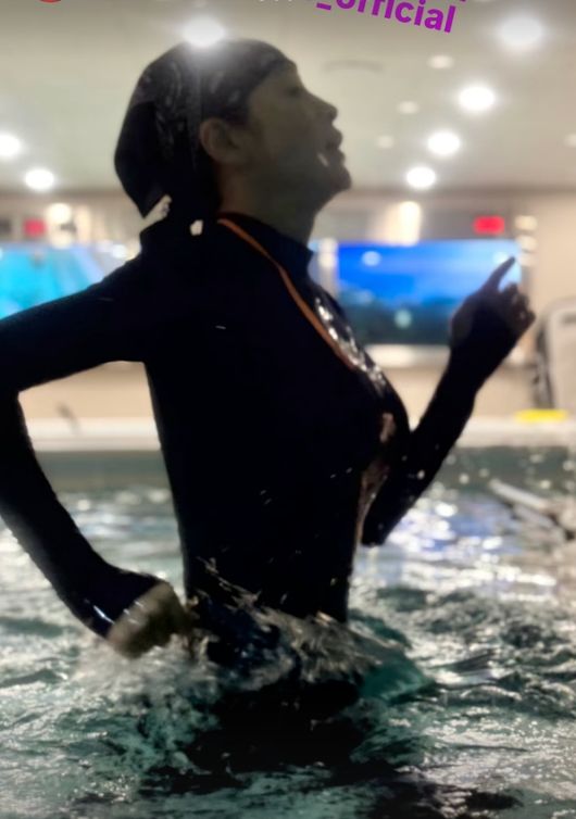 공개된 사진에는 운동 중인 김혜수의 모습이 담겨 있었다. 김혜수는 두건을 쓴 채 래쉬가드 수영복을 입고 물 속에서 달리며 운동을 하고 있다. 집중한 표정으로 운동에 매진하고 있는 김혜수였다.