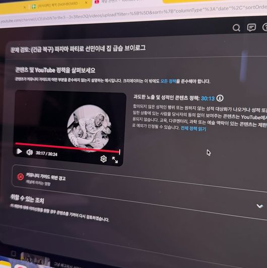 더불어 ‘파자마 파티로 선민이네 집 급습 브이로그’ 영상이 ‘과도한 노출 및 성적인 콘텐츠 정책’을 위반했다는 안내가 담긴 화면을 캡처해 공개했다.
