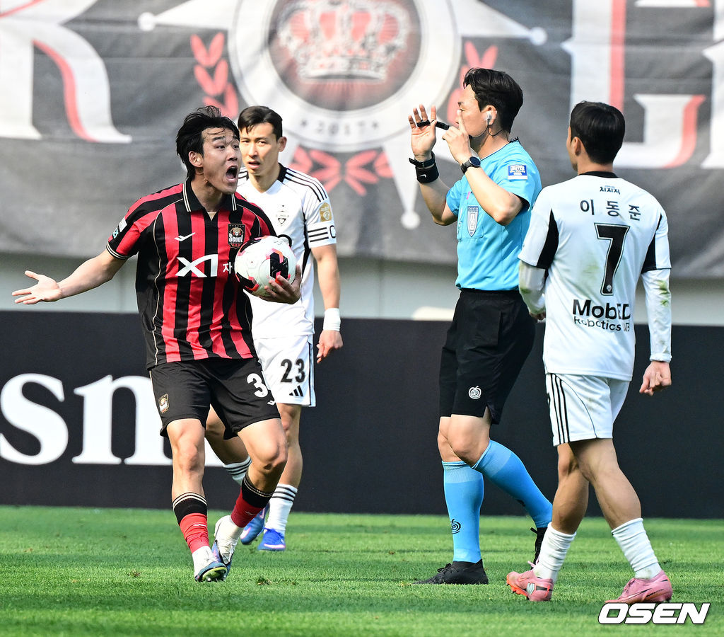 후반 서울 송민규가 주심 판정에 불만을 나타내고 있다. 2026.04.11 / jpnews@osen.co.kr