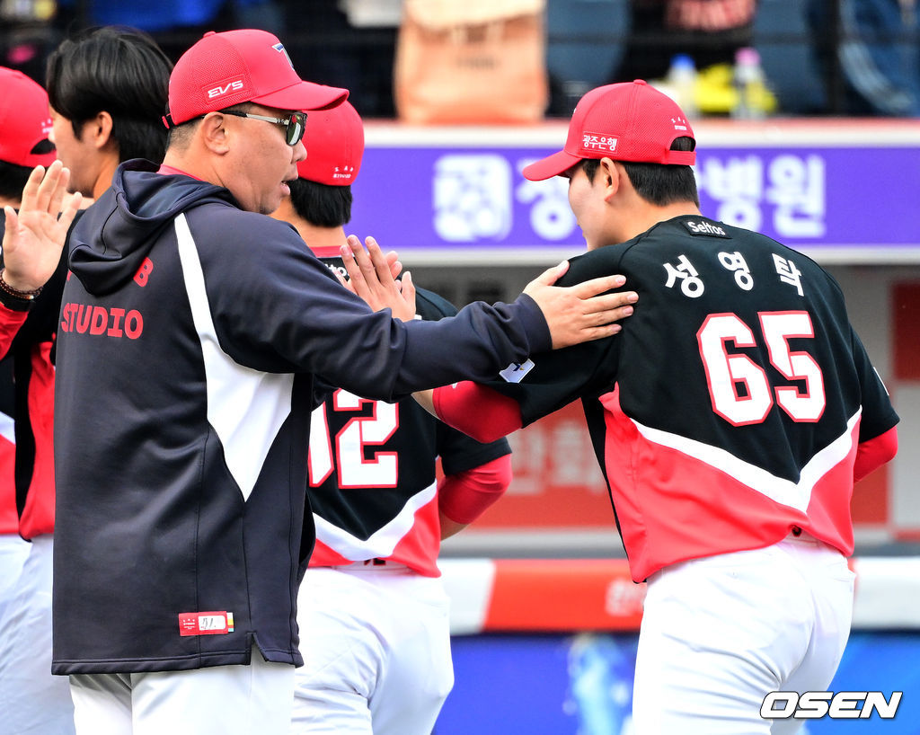 경기를 마치고 KIA 이범호 감독과 세이브를 거둔 성영탁이 인사를 나누고 있다. 2026.04.11 / dreamer@osen.co.kr