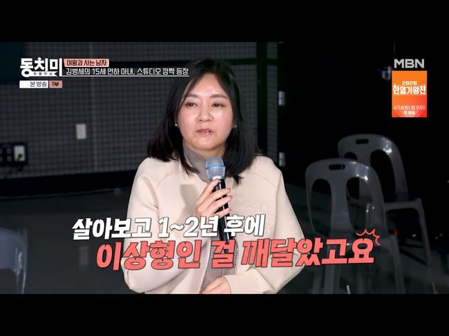 최초로 공개된 아내는 꽤 시니컬한 편이었다. 김병세 아내는 “첫인상은 솔직히, 제가 미술을 해서 그런지 이미지로 봤거든요? 키가 왜 이렇게 작지? 되게 위축돼 있고, 시무룩해 있었어요”라며 “그리고 빛의 효과라고 생각한다. 제가 앉은 자리가 역광이었다. 그래서 후광으로 보였을 거다”라고 말했다.