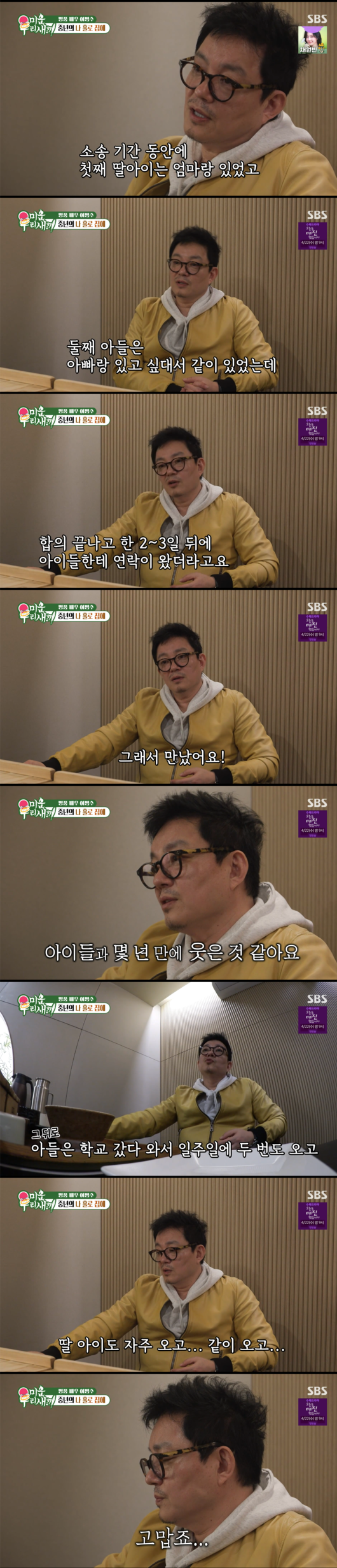 이범수는 “합의 끝나고 한 2~3일 뒤에 아이들에게 연락이 왔다. 보고 싶다고. 그래서 만났다. 아이들과 몇 년 만에 웃은 것 같아요. 아들은 학교 갔다 와서 일주일에 두 번도 오고. 딸아이도 자주 오고. 같이 오고. 고맙죠”라고 말하며 깊은 안도감을 드러냈다.