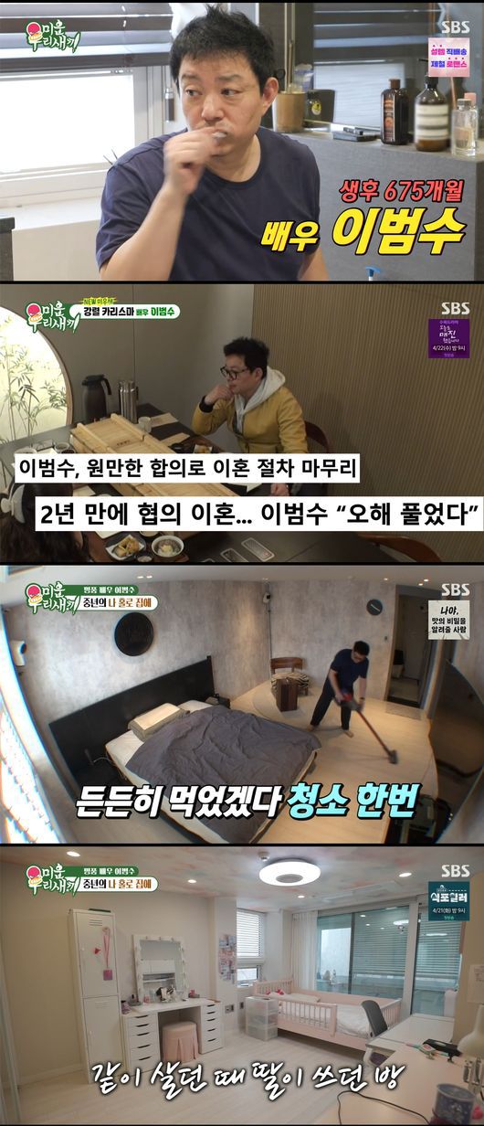 12일 방송된 SBS ‘미운 우리 새끼’에서는 최근 합의 이혼 소식을 알린 이범수가 새 멤버로 합류, 홀로 지내는 일상을 처음으로 공개했다.