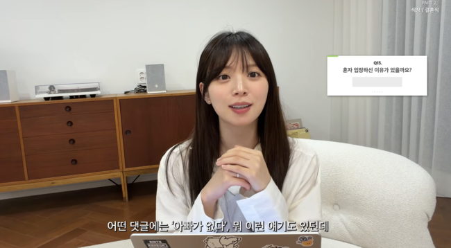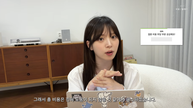 결혼식 관련, 남편과 자신 둘 다 부모님의 지원을 따로 받지는 않았다는 그는 "결혼 관련된 비용은 전부 남편이 해줬다. 내가 직업적 특수성이 있어서 감사하게도 협찬이나 할인이 되게 많이 되는 구조였다"라고 설명했다. 혼수에 대해서는 "이미 미혼일 때 살던 집에 혼수가 다 돼 있었다. 가구나 가전이 다 되어 있었다"라고 덧붙였다.